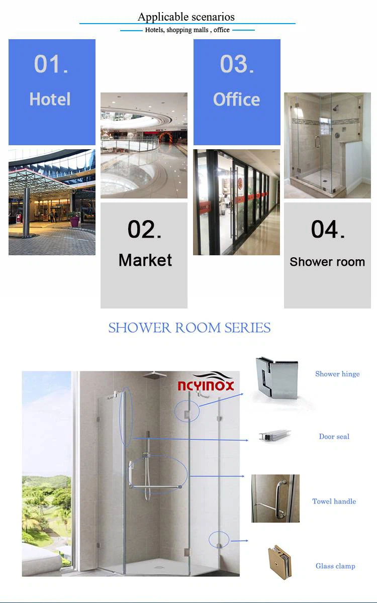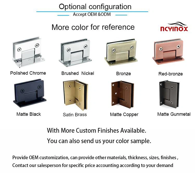Okretna šarka za staklena vrata od 360 stupnjeva popularna je posljednjih godina. Popularno se prodaje na svim tržištima. Ovo je vrlo posebna šarka za tuš ili šarka za staklena vrata. Budući da ima zakretnu stražnju ploču na dnu. Može se okrenuti ili okretati za 360 stupnjeva .Donju ploču treba pričvrstiti na zid, a ploče šarki trebaju držati staklo. Ova okretna šarka prikladna je za staklena vrata malih kupaonica. Vrlo je praktična i fleksibilna za otvaranje i zatvaranje staklenih vrata tuš kabine u malim prostora. Obično se može vidjeti na vratima kupaonice apartmana, vratima kupaonice motela. Stil je kosi rub, a ne kvadrat. Ali ako vam se sviđa kvadratni rub, možemo proizvesti i četvrtasta. Troškovi su isti uz iste materijale i boje. Cijena varira od materijala, boja, debljine šarke. Uobičajena debljina je 5 mm. Ako trebate smanjiti cijenu, možemo izraditi debljinu ploča od 4 mm. Postoje različite opcije materijala za ovo staklo od 360 šarke za vrata. Mjed, nehrđajući čelik 316, nehrđajući čelik 304 i legura cinka. Naš uobičajeni proizvodni proces šarki je "lijevanje pod pritiskom". Ali neki kupci zahtijevaju proizvode s nižim troškovima. Šarke možemo proizvesti i "zavarivanjem" " proces po nižoj cijeni. Kvaliteta je jednaka cijeni. Možemo napraviti različite kvalitete po različitim cijenama kako bismo zadovoljili vaše potrebe. Budući da je Yuxinda profesionalni proizvođač staklenih hardverskih proizvoda od 2007. Ne samo da možemo pružiti staklene šarke ili ručke, ali također može ponuditi naša rješenja koja će vam pomoći da završite projekte.